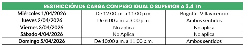 - El domingo 5 de abril de 2026 la Policía de Tránsito y Transporte realizará el reversible Villavicencio – Bogotá con cierre a la 1:00 p.m. en el Uval para habilitar la vía en un solo sentido desde las 3:00 p.m. hasta las 11:00 p.m.